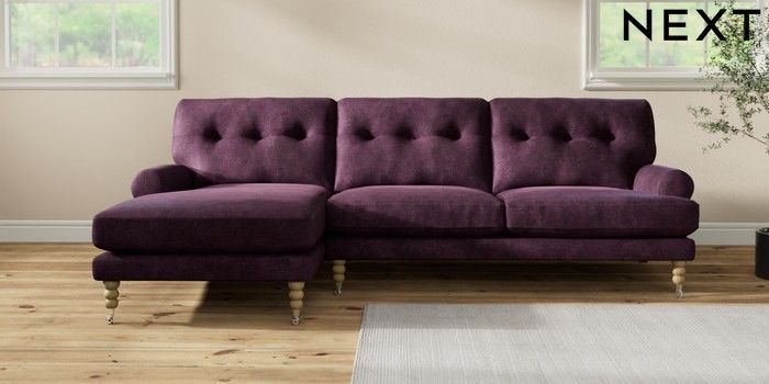 7.2.10 Erin Buttoned Back Deep Relaxed Sit Medium Sofa Chaise - Left Hand Plush Chenille Dark Plum Purple High Classic Turned Chrome Castor - Light | Made Click here to use our website with more accessibility support, for example screen readers