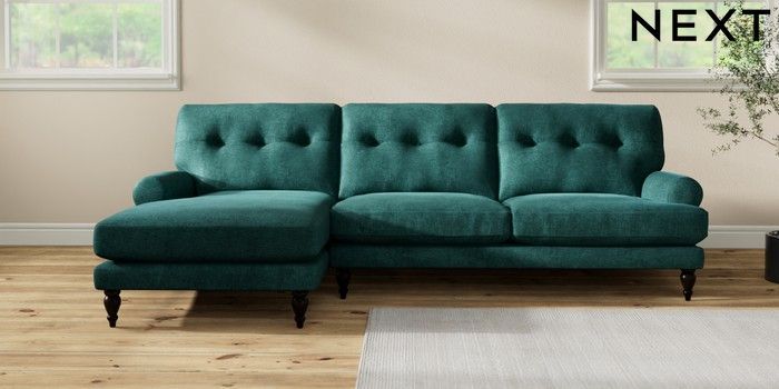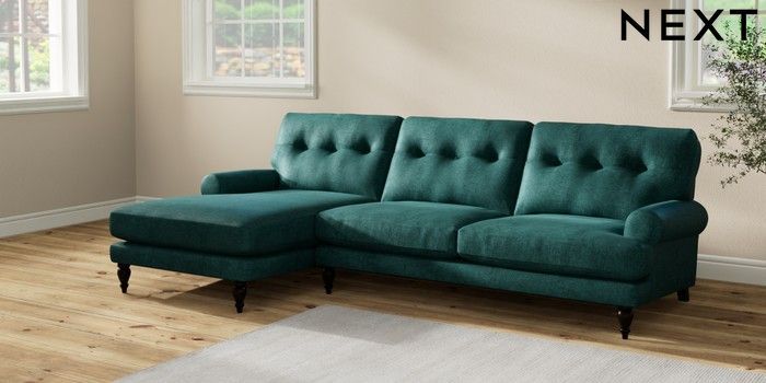 7.2.10 Erin Buttoned Back Deep Relaxed Sit Medium Sofa Chaise - Left Hand Plush Chenille Dark Teal Green High Classic Turned - Dark | Made Click here to use our website with more accessibility support, for example screen readers