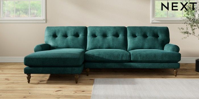 7.2.10 Erin Buttoned Back Deep Relaxed Sit Medium Sofa Chaise - Left Hand Plush Chenille Dark Teal Green High Classic Turned - Mid | Made Click here to use our website with more accessibility support, for example screen readers
