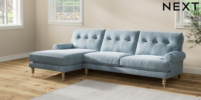 7.2.10 Erin Buttoned Back Deep Relaxed Sit Medium Sofa Chaise - Left Hand Plush Chenille Light Blue High Classic Turned Chrome Castor - Light | Made Click here to use our website with more accessibility support, for example screen readers