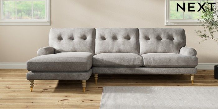 7.2.10 Erin Buttoned Back Deep Relaxed Sit Medium Sofa Chaise - Left Hand Plush Chenille Light Grey High Classic Turned Brass Castor - Light | Made Click here to use our website with more accessibility support, for example screen readers