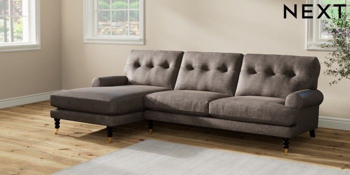 7.2.10 Erin Buttoned Back Deep Relaxed Sit Medium Sofa Chaise - Left Hand Plush Chenille Mink Brown High Classic Turned Brass Castor - Dark | Made Click here to use our website with more accessibility support, for example screen readers