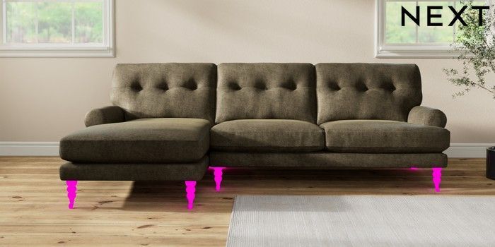 7.2.10 Erin Buttoned Back Deep Relaxed Sit Medium Sofa Chaise - Left Hand Plush Chenille Moss Green High Classic Turned Brass Castor - Dark | Made Click here to use our website with more accessibility support, for example screen readers