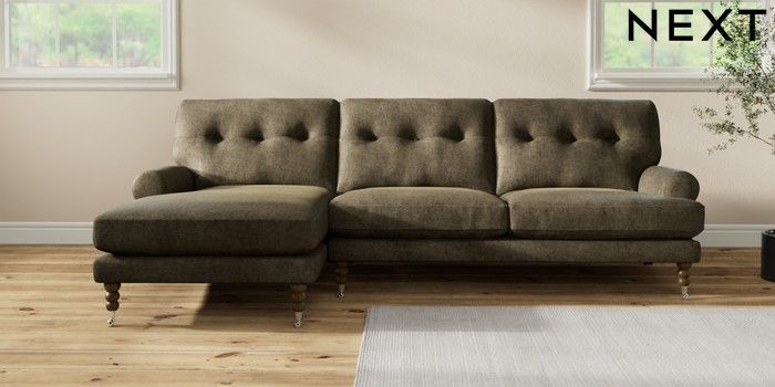 7.2.10 Erin Buttoned Back Deep Relaxed Sit Medium Sofa Chaise - Left Hand Plush Chenille Moss Green High Classic Turned Chrome Castor - Mid | Made Click here to use our website with more accessibility support, for example screen readers