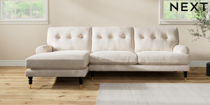 7.2.10 Erin Buttoned Back Deep Relaxed Sit Medium Sofa Chaise - Left Hand Plush Chenille Oyster High Classic Turned Brass Castor - Dark | Made Click here to use our website with more accessibility support, for example screen readers