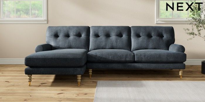 7.2.10 Erin Buttoned Back Deep Relaxed Sit Medium Sofa Chaise - Left Hand Plush Chenille Slate Blue High Classic Turned Brass Castor - Light | Made Click here to use our website with more accessibility support, for example screen readers