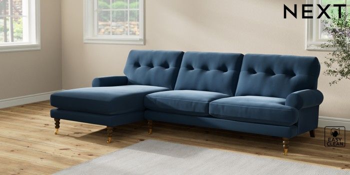 7.2.10 Erin Buttoned Back Deep Relaxed Sit Medium Sofa Chaise - Left Hand Plush Velvet Easy Clean Airforce Blue High Classic Turned Brass Castor - Mid | Made Click here to use our website with more accessibility support, for example screen readers