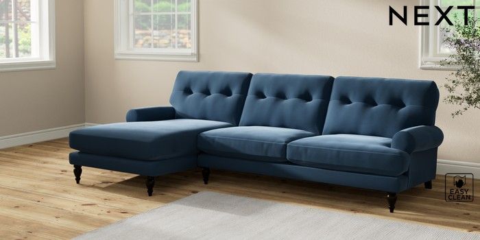7.2.10 Erin Buttoned Back Deep Relaxed Sit Medium Sofa Chaise - Left Hand Plush Velvet Easy Clean Airforce Blue High Classic Turned - Dark | Made Click here to use our website with more accessibility support, for example screen readers
