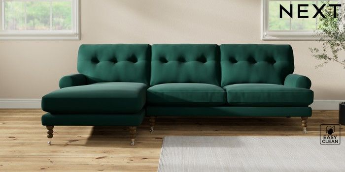 7.2.10 Erin Buttoned Back Deep Relaxed Sit Medium Sofa Chaise - Left Hand Plush Velvet Easy Clean Bottle Green High Classic Turned Chrome Castor - Mid | Made Click here to use our website with more accessibility support, for example screen readers