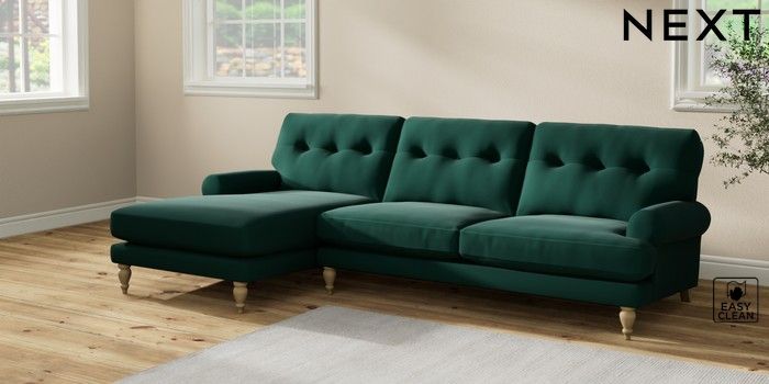 7.2.10 Erin Buttoned Back Deep Relaxed Sit Medium Sofa Chaise - Left Hand Plush Velvet Easy Clean Bottle Green High Classic Turned - Light | Made Click here to use our website with more accessibility support, for example screen readers