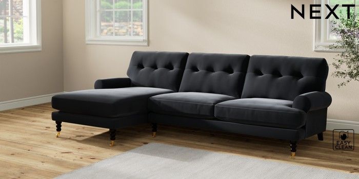 7.2.10 Erin Buttoned Back Deep Relaxed Sit Medium Sofa Chaise - Left Hand Plush Velvet Easy Clean Charcoal Grey High Classic Turned Brass Castor - Dark | Made Click here to use our website with more accessibility support, for example screen readers
