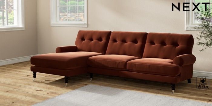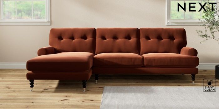 7.2.10 Erin Buttoned Back Deep Relaxed Sit Medium Sofa Chaise - Left Hand Plush Velvet Easy Clean Ginger Orange High Classic Turned Chrome Castor - Dark | Made Click here to use our website with more accessibility support, for example screen readers