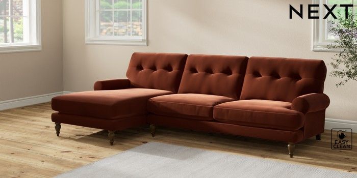 7.2.10 Erin Buttoned Back Deep Relaxed Sit Medium Sofa Chaise - Left Hand Plush Velvet Easy Clean Ginger Orange High Classic Turned - Mid | Made Click here to use our website with more accessibility support, for example screen readers