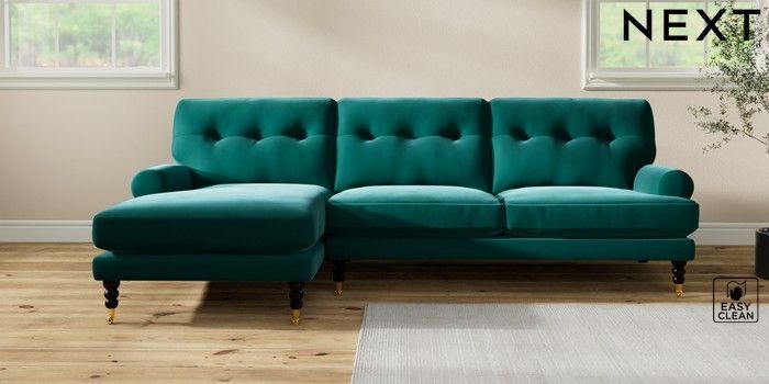 7.2.10 Erin Buttoned Back Deep Relaxed Sit Medium Sofa Chaise - Left Hand Plush Velvet Easy Clean Juniper Green High Classic Turned Brass Castor - Dark | Made Click here to use our website with more accessibility support, for example screen readers