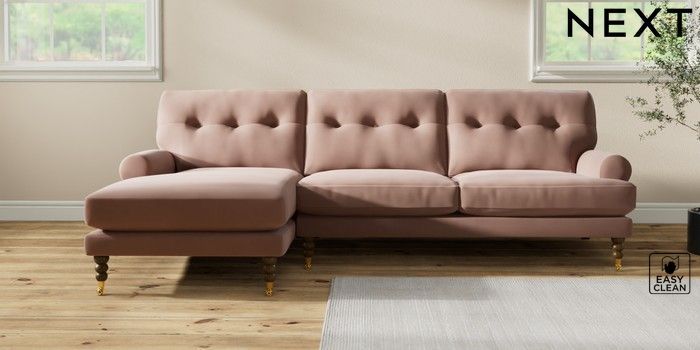 7.2.10 Erin Buttoned Back Deep Relaxed Sit Medium Sofa Chaise - Left Hand Plush Velvet Easy Clean Mid Natural High Classic Turned Brass Castor - Mid | Made Click here to use our website with more accessibility support, for example screen readers