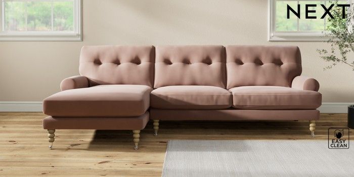 7.2.10 Erin Buttoned Back Deep Relaxed Sit Medium Sofa Chaise - Left Hand Plush Velvet Easy Clean Mid Natural High Classic Turned Chrome Castor - Light | Made Click here to use our website with more accessibility support, for example screen readers