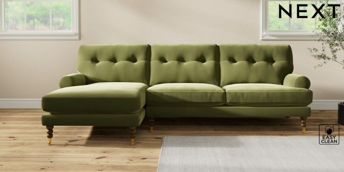 7.2.10 Erin Buttoned Back Deep Relaxed Sit Medium Sofa Chaise - Left Hand Plush Velvet Easy Clean Mid Olive Green High Classic Turned Brass Castor - Mid | Made Click here to use our website with more accessibility support, for example screen readers