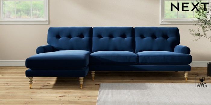 7.2.10 Erin Buttoned Back Deep Relaxed Sit Medium Sofa Chaise - Left Hand Plush Velvet Easy Clean Navy Blue High Classic Turned Brass Castor - Light | Made Click here to use our website with more accessibility support, for example screen readers