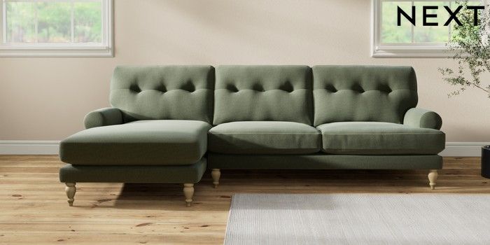 7.2.10 Erin Buttoned Back Deep Relaxed Sit Medium Sofa Chaise - Left Hand Relaxed Linen Look Dark Green High Classic Turned - Light | Made Click here to use our website with more accessibility support, for example screen readers