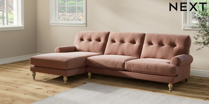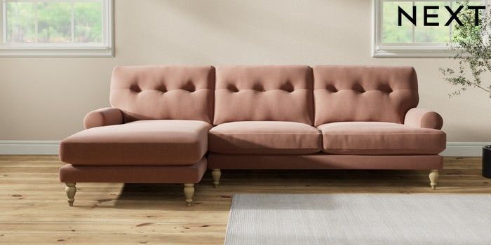 7.2.10 Erin Buttoned Back Deep Relaxed Sit Medium Sofa Chaise - Left Hand Relaxed Linen Look Light Rust Brown High Classic Turned - Light | Made Click here to use our website with more accessibility support, for example screen readers