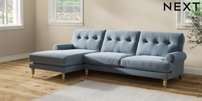 7.2.10 Erin Buttoned Back Deep Relaxed Sit Medium Sofa Chaise - Left Hand Relaxed Linen Look Mid Blue High Classic Turned Brass Castor - Light | Made Click here to use our website with more accessibility support, for example screen readers