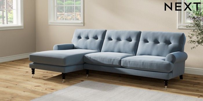 7.2.10 Erin Buttoned Back Deep Relaxed Sit Medium Sofa Chaise - Left Hand Relaxed Linen Look Mid Blue High Classic Turned Chrome Castor - Dark | Made Click here to use our website with more accessibility support, for example screen readers