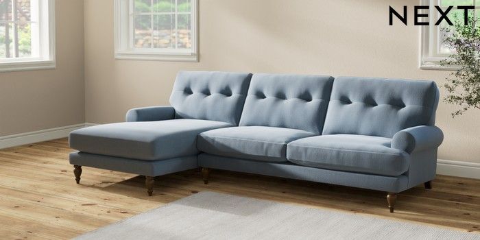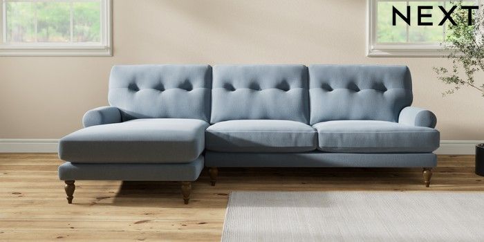 7.2.10 Erin Buttoned Back Deep Relaxed Sit Medium Sofa Chaise - Left Hand Relaxed Linen Look Mid Blue High Classic Turned - Mid | Made Click here to use our website with more accessibility support, for example screen readers