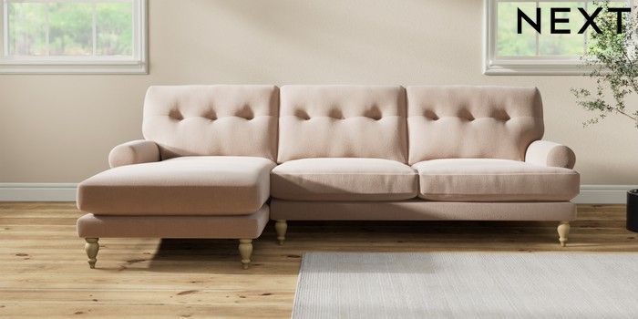 7.2.10 Erin Buttoned Back Deep Relaxed Sit Medium Sofa Chaise - Left Hand Relaxed Linen Look Mid Natural High Classic Turned - Light | Made Click here to use our website with more accessibility support, for example screen readers