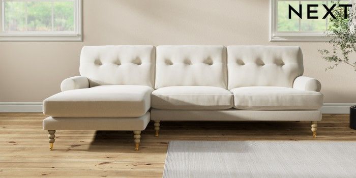 7.2.10 Erin Buttoned Back Deep Relaxed Sit Medium Sofa Chaise - Left Hand Relaxed Linen Look Oyster High Classic Turned Brass Castor - Light | Made Click here to use our website with more accessibility support, for example screen readers
