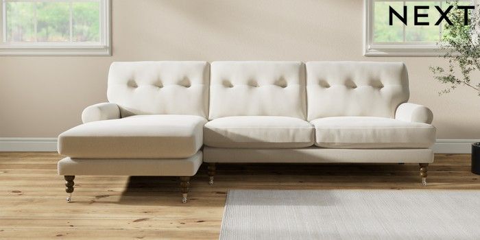 7.2.10 Erin Buttoned Back Deep Relaxed Sit Medium Sofa Chaise - Left Hand Relaxed Linen Look Oyster High Classic Turned Chrome Castor - Mid | Made Click here to use our website with more accessibility support, for example screen readers