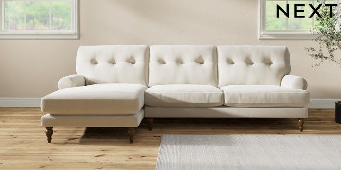 7.2.10 Erin Buttoned Back Deep Relaxed Sit Medium Sofa Chaise - Left Hand Relaxed Linen Look Oyster High Classic Turned - Mid | Made Click here to use our website with more accessibility support, for example screen readers
