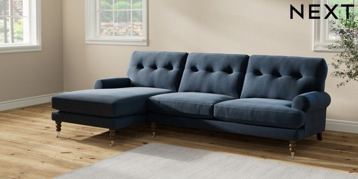 7.2.10 Erin Buttoned Back Deep Relaxed Sit Medium Sofa Chaise - Left Hand Ripple Chenille Dark Blue High Classic Turned Chrome Castor - Mid | Made Click here to use our website with more accessibility support, for example screen readers