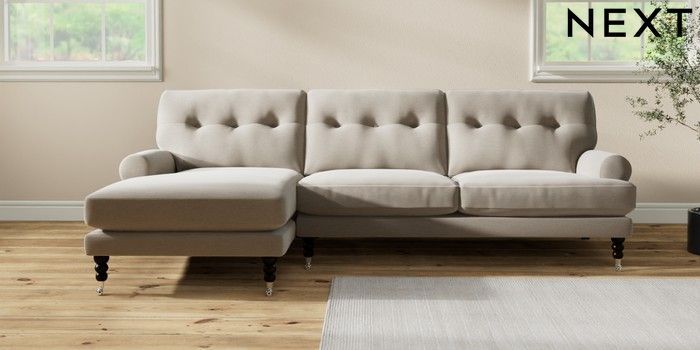 7.2.10 Erin Buttoned Back Deep Relaxed Sit Medium Sofa Chaise - Left Hand Ripple Chenille Light Natural High Classic Turned Chrome Castor - Dark | Made Click here to use our website with more accessibility support, for example screen readers