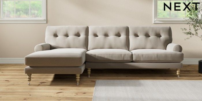 7.2.10 Erin Buttoned Back Deep Relaxed Sit Medium Sofa Chaise - Left Hand Ripple Chenille Light Natural High Classic Turned Chrome Castor - Light | Made Click here to use our website with more accessibility support, for example screen readers