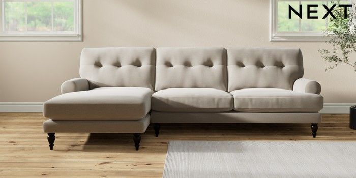 7.2.10 Erin Buttoned Back Deep Relaxed Sit Medium Sofa Chaise - Left Hand Ripple Chenille Light Natural High Classic Turned - Dark | Made Click here to use our website with more accessibility support, for example screen readers