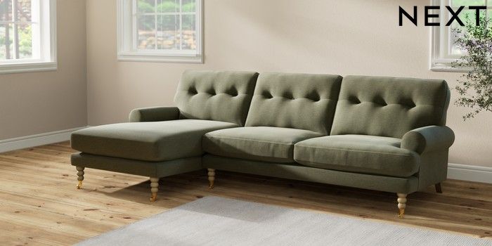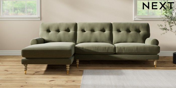 7.2.10 Erin Buttoned Back Deep Relaxed Sit Medium Sofa Chaise - Left Hand Ripple Chenille Mid Moss Green High Classic Turned Brass Castor - Light | Made Click here to use our website with more accessibility support, for example screen readers