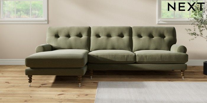 7.2.10 Erin Buttoned Back Deep Relaxed Sit Medium Sofa Chaise - Left Hand Ripple Chenille Mid Moss Green High Classic Turned Chrome Castor - Mid | Made Click here to use our website with more accessibility support, for example screen readers