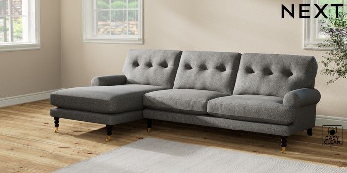 7.2.10 Erin Buttoned Back Deep Relaxed Sit Medium Sofa Chaise - Left Hand Tweedy Blend Easy Clean Dark Grey High Classic Turned Brass Castor - Dark | Made Click here to use our website with more accessibility support, for example screen readers