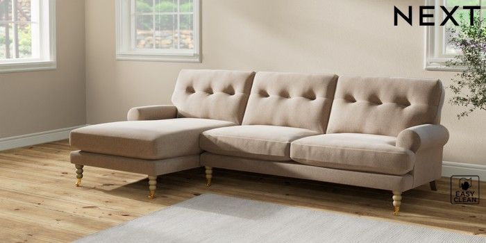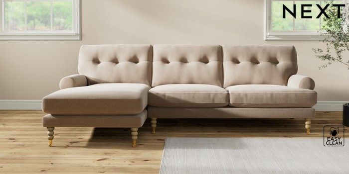 7.2.10 Erin Buttoned Back Deep Relaxed Sit Medium Sofa Chaise - Left Hand Tweedy Blend Easy Clean Light Dove Natural High Classic Turned Brass Castor - Light | Made Click here to use our website with more accessibility support, for example screen readers