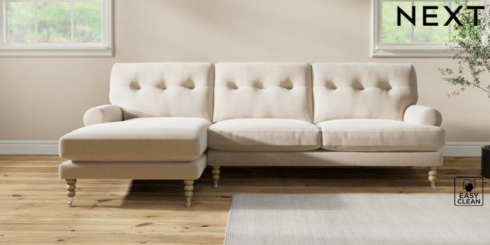 7.2.10 Erin Buttoned Back Deep Relaxed Sit Medium Sofa Chaise - Left Hand Tweedy Blend Easy Clean Oyster High Classic Turned Chrome Castor - Light | Made Click here to use our website with more accessibility support, for example screen readers