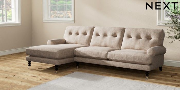 7.2.10 Erin Buttoned Back Deep Relaxed Sit Medium Sofa Chaise - Left Hand Tweedy Chenille Mid Natural High Classic Turned Chrome Castor - Dark | Made Click here to use our website with more accessibility support, for example screen readers