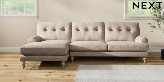 7.2.10 Erin Buttoned Back Deep Relaxed Sit Medium Sofa Chaise - Left Hand Tweedy Chenille Mid Natural High Classic Turned - Light | Made Click here to use our website with more accessibility support, for example screen readers