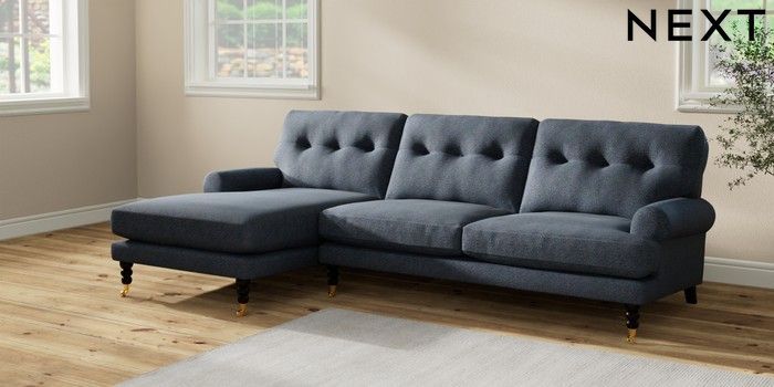 7.2.10 Erin Buttoned Back Deep Relaxed Sit Medium Sofa Chaise - Left Hand Tweedy Chenille Navy Blue High Classic Turned Brass Castor - Dark | Made Click here to use our website with more accessibility support, for example screen readers