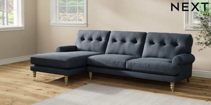 7.2.10 Erin Buttoned Back Deep Relaxed Sit Medium Sofa Chaise - Left Hand Tweedy Chenille Navy Blue High Classic Turned Chrome Castor - Light | Made Click here to use our website with more accessibility support, for example screen readers