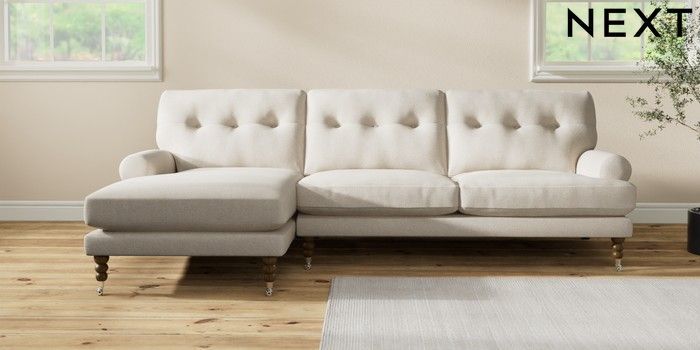 7.2.10 Erin Buttoned Back Deep Relaxed Sit Medium Sofa Chaise - Left Hand Tweedy Chenille Oyster High Classic Turned Chrome Castor - Mid | Made Click here to use our website with more accessibility support, for example screen readers