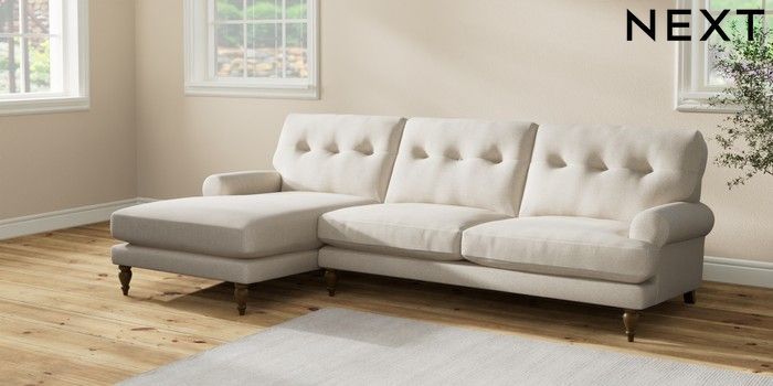 7.2.10 Erin Buttoned Back Deep Relaxed Sit Medium Sofa Chaise - Left Hand Tweedy Chenille Oyster High Classic Turned - Mid | Made Click here to use our website with more accessibility support, for example screen readers