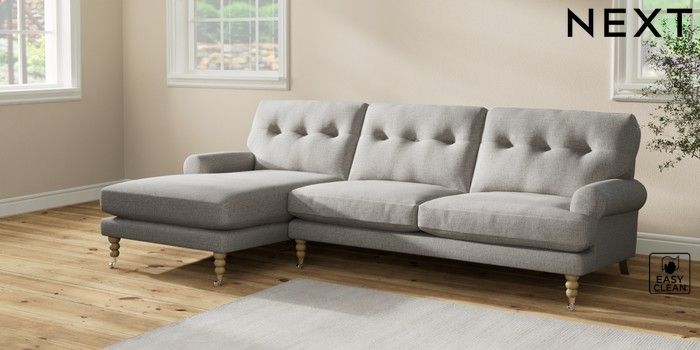 7.2.10 Erin Buttoned Back Deep Relaxed Sit Medium Sofa Chaise - Left Hand Woven Chenille Easy Clean Light Grey High Classic Turned Chrome Castor - Light | Made Click here to use our website with more accessibility support, for example screen readers