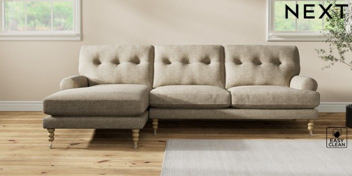 7.2.10 Erin Buttoned Back Deep Relaxed Sit Medium Sofa Chaise - Left Hand Woven Chenille Easy Clean Mid Natural High Classic Turned Chrome Castor - Light | Made Click here to use our website with more accessibility support, for example screen readers