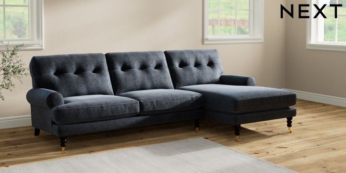 7.2.10 Erin Buttoned Back Deep Relaxed Sit Medium Sofa Chaise - Right Hand Boucle Chenille Dark Slate Blue High Classic Turned Brass Castor - Dark | Made Click here to use our website with more accessibility support, for example screen readers