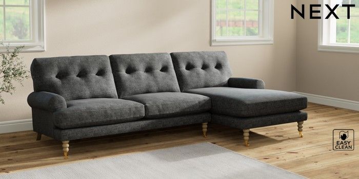 7.2.10 Erin Buttoned Back Deep Relaxed Sit Medium Sofa Chaise - Right Hand Boucle Weave Easy Clean Charcoal Grey High Classic Turned Brass Castor - Light | Made Click here to use our website with more accessibility support, for example screen readers